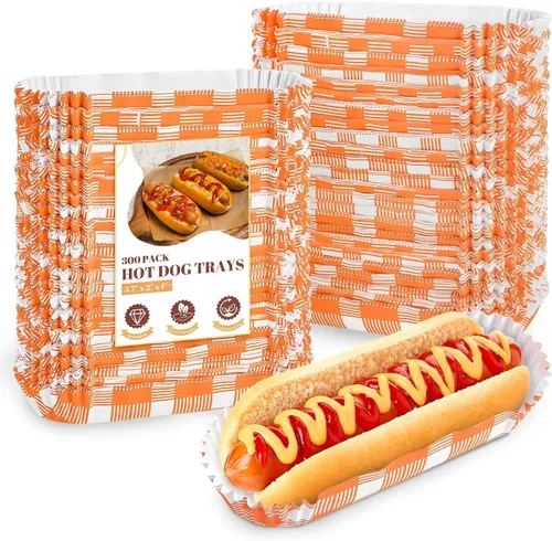 Cantidad a granel: 300 bandejas de papel para perros calientes, cada bandeja de comida pequeña mide aproximadamente 5.71 x 1.97 x 0.98 pulgadas, no solo para soportes para perros calientes, también es ideal para brochetas fritas de una sola porción, brochetas a la parrilla, pollo, carne, nachos, embutidos, frutas o servir otros alimentos pequeños. Cómodo de usar: estos botes desechables de papel están listos para usar todo el tiempo, perfectos para servir alimentos de fiesta, cumpleaños, bodas, barbacoas, llevar, cualquier evento interior y exterior. También es ideal para pequeños negocios en cualquier ocasión, camiones de comida, puestos de concesión, carnavales, estadios, teatros, etc. Bandejas duraderas para perros calientes: nuestras bandejas de papel para alimentos están hechas de papel grueso de grado alimenticio con una capa resistente a la grasa en el interior, lo que puede evitar que las salsas o aceites se empapen. Apto para horno, congelador y microondas: estos platos para perros calientes son seguros para recalentar en el microondas, lo que le permite servir alimentos calientes rápidamente sin cambiar de recipiente. Cada bandeja para perros calientes maneja el calor sin deformación ni fugas. Diseño estriado: nuestra bandeja para perros calientes cuenta con un elegante diseño acanalado que mantiene el perro caliente estable y evita que se caiga, evita un desorden con estas bandejas para perros calientes que manejan alimentos jugosos con facilidad.