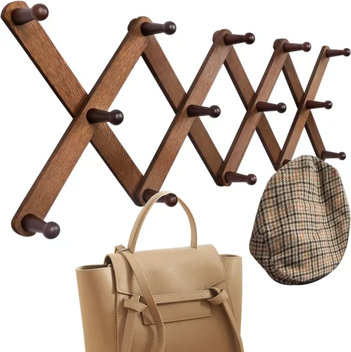 100% madera de pino. Madera maciza resistente: hecha de madera de pino de alta calidad, saludable y sin olor (el producto real puede ser ligeramente diferente de las imágenes debido a las diferentes texturas del material de madera o variaciones de fabricación) DISEÑO DE ACORDEÓN: Este gancho de madera montado en la pared es ampliable, fácilmente ajustable al ancho requerido. Buena opción para habitaciones que necesitan un poco de espacio u organización extra Multiusos: cada estante viene con 14 clavijas en total, solución perfecta para colgar abrigos, chaquetas, sombreros, gorras de béisbol, bufandas, cinturones, tazas, bolsas y correas para perros Percha versátil: este perchero decorativo de madera es perfecto para organizar cualquier entrada, pasillos, vestíbulo, cocina, sala de estar, baño, dormitorio o armario Fácil de instalar: viene con juntas colgantes de metal en la parte posterior, listas para colgar en la pared o puerta