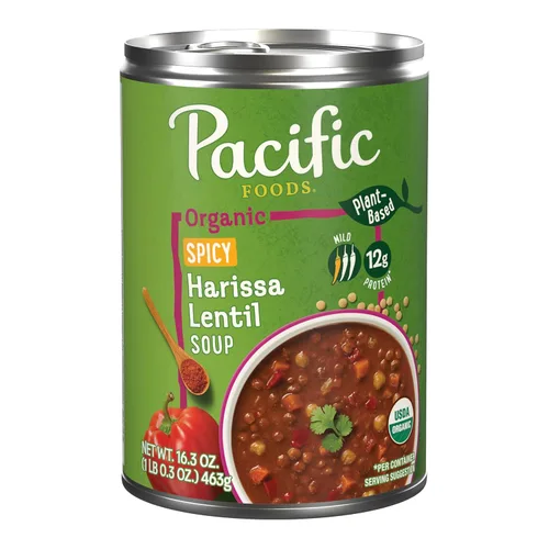 Una lata de 16.3 oz. de sopa de lentejas picante Harissa orgánica de Pacific Foods Hecho con lentejas verdes, garbanzos y verduras junto con ricas especias para un nivel de picante suave Sopa de verduras orgánica y sin OMG certificada por USDA Está delicioso por sí solo, personalizado con tus coberturas favoritas, o combinado con una ensalada, sándwich o wrap Esta sopa enlatada tiene 12 gramos de proteína por lata