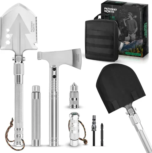 No solo para el hombre o la mujer al aire libre, este juego de supervivencia es una adición sólida a vehículos todoterreno, RV, UTV, ATV, camioneros o el maletero de tu automóvil. Ya sea que te llame preparador o explorador, este divisor de troncos de piratería rápida y la pala plegable compacta son dos de las herramientas más útiles necesarias para la supervivencia. El hacha de supervivencia de acero inoxidable 3CR13 es una mezcla de cromo y carbono, por lo que es ultra fuerte y resistente a la corrosión. La hoja afilada hace carne picada de proyectos de corte de madera dura y blanda. Dividir leña, cortar ramas o salir de un vehículo. Ningún trabajo es demasiado duro para este hacha táctica. Pala de campamento ideal: pala de campamento ideal, para limpiar el suelo de rocas, enterrar tu fuego de campamento, cavar agujeros de saneamiento y mucho más. El mango de pala todoterreno Pathway North se basa en una ergonomía antideslizante, mientras que las 2 barras de extensión hacen que esta herramienta electrónica sea fácil de trabajar al cavar agujeros profundos. Utiliza el lado dentado de la pala portátil para cortar a través de terrenos difíciles como raíces, enredaderas o ramas. El juego de hacha/pala de Bushcraft Ultimate incluye: 1 1 arrancador de fuego con silbato | Llaves hexagonales | 2 barras de extensión | 1 juego de destornilladores (Philips y cabeza plana) | 1 interruptor de ventana | 1 x Riñonera de lona táctica. Utiliza el tubo para almacenar otros artículos esenciales de supervivencia o primeros auxilios en el interior. ¿Fuera de la carretera, el senderismo, el camping, la pesca y las misiones de rescate te llenan de alegría? Entonces será mejor que lleve el Pathway North Shovel and Axe Set para el viaje. Esté preparado y listo para cualquier situación. Si tienes alguna pregunta, comunícate con nuestro equipo de servicio al cliente. 🔴
