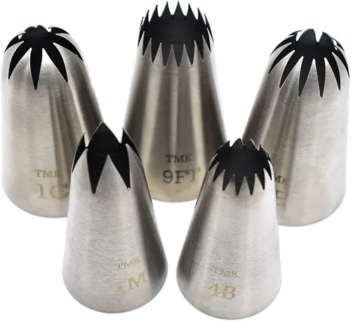 El paquete incluye: 5 boquillas de tubería grandes de estrella abierta Timkumon #1M 4B (0.984 in), #9FT 1C 1E (30MM). Material: hecho de acero inoxidable 304, las boquillas de tubería Timkumon son sin costuras, fáciles de usar y limpiar. Características: Dispensadores de glaseado de punta de tubería Timkumon de estrella abierta sin costuras de acero inoxidable, sin espacios visibles en el interior o exterior de las puntas de decoración. Adecuado para: Adecuado para principiantes y panaderos profesionales. Gran regalo: regalo perfecto para niños y amigos. Los consejos de decoración de pasteles son una gran opción de regalo para cumpleaños, aniversarios, Navidad, etc