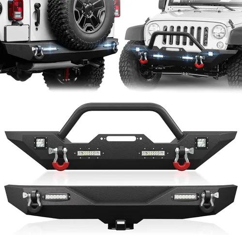 Compatibilidad: compatible con modelos Jeep Wrangler JK JKU Unlimited 2 puertas y 4 puertas 2007-2018. Confirma la compatibilidad con tu vehículo antes de comprar. Materiales de alta calidad: nuestros parachoques delantero y trasero están hechos de acero robusto de alta resistencia. Tienen un recubrimiento en polvo negro texturizado para un aspecto elegante y protección adicional. Estos parachoques están diseñados para resistir el óxido, asegurando un rendimiento duradero incluso si la capa de polvo se daña. Accesorios completos: el parachoques delantero cuenta con una robusta barra de toro, una placa de cabrestante (capacidad de 12,000 libras) y dos anillos en D de 4.75 toneladas. Está equipado con dos focos horizontales. También viene con dos aros de pre-corredor para luces adicionales fuera de carretera. El parachoques trasero está equipado con anillos en D de capacidad de 4.75 toneladas (clasificados en 9500 libras. ), y un enganche receptor estándar de 2". 【Fácil de instalar】Nuestros parachoques delanteros y traseros están diseñados para una fácil instalación con una práctica solución atornillada. Se pueden instalar rápida y fácilmente sin modificaciones en el vehículo. Para tu seguridad, se recomienda una instalación profesional. Soporte posventa completo: este producto está respaldado por 1 año de garantía de fábrica y soporte de servicio al cliente de por vida. El paquete incluye instrucciones de instalación del producto, y nuestro equipo siempre está disponible para ayudarlo con cualquier pregunta o inquietud que pueda tener. No dude en ponerse en contacto con nosotros para obtener ayuda.