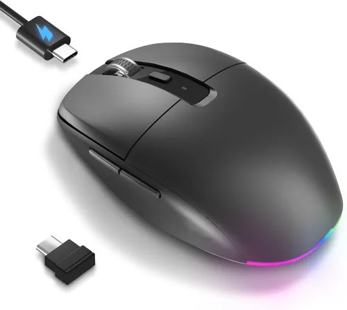 Receptor tipo C y carga rápida: incluye un receptor tipo C compacto para portátiles/tabletas/teléfonos modernos y un adaptador USB para computadoras de escritorio. Recarga a través de tipo C en ~ 2 horas – no más comprar baterías! Iluminación RGB vibrante y clics silenciosos: cuenta con una luz trasera dinámica de 7 colores (siempre encendida durante el uso) para estilo y fácil visibilidad en habitaciones tenues. Los botones silenciosos + la rueda de desplazamiento garantizan un funcionamiento silencioso en cualquier lugar. 3 ajustes de DPI ajustables: cambia fácilmente la sensibilidad (800/1200/1600 DPI) para un control preciso en el trabajo, juegos o tareas diarias. Diseño ergonómico y cómodo: la forma contorneada ligera proporciona un cómodo soporte de palma y un posicionamiento relajado para dedos y muñecas durante un uso prolongado. Batería larga y sueño inteligente: Disfruta de hasta 1 mes de uso regular o 1,5 meses en espera. El apagado automático ahorra energía.