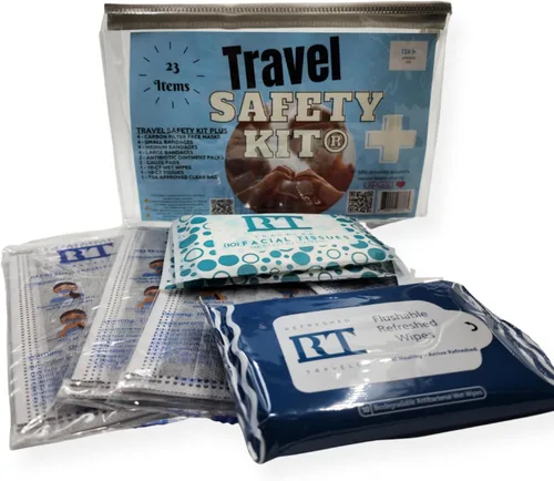 Mantente seguro, saludable y preparado, dondequiera que tu viaje te lleve con nuestro Travel Safety Kit Plus. Este kit único y compacto combina convenientemente los elementos esenciales de seguridad de viaje y un botiquín de primeros auxilios para garantizar tu tranquilidad durante cualquier aventura. El Travel Safety Kit Plus está cuidadosamente diseñado para el viajero moderno, atendiendo a cada giro inesperado que pueda encontrar en sus viajes. Equipado con todo lo que necesitas, pero lo suficientemente compacto como para caber en tu equipaje de mano, este kit pronto se convertirá en tu compañero de viaje favorito. Dentro de la bolsa de viaje reutilizable transparente aprobada por la TSA, encontrará: Esenciales de viaje: Tejidos de viaje: Mantenga los olfatos a raya con estos pañuelos de viaje suaves y duraderos Toallitas húmedas: Mantenga la limpieza sobre la marcha con estas toallitas húmedas rápidas y fáciles de usar 4 Mascarillas con filtro de carbono envueltas individualmente: Transpirables, cómodas y desechables para una máxima protección y comodidad. Esenciales de primeros auxilios: 12 vendas (4 pequeñas, 4 medianas, 4 grandes): aborda cortes y abrasiones menores con este paquete de vendas variadas. 2 paquetes de ungüento antibiótico: Proteja sus heridas de infecciones y ayude a curar con estos paquetes de ungüentos fáciles de usar. 2 almohadillas de gasa: para cortes o lesiones más grandes, estas almohadillas de gasa proporcionan la primera línea de defensa. Desde la concurrida terminal del aeropuerto hasta las carreteras secundarias de tu aventura, Travel Safety Kit Plus es un imprescindible para todas tus necesidades de viaje. Este kit es perfecto para viajes en solitario, vacaciones familiares, viajes de negocios, aventuras de mochilero y mucho más. Viaja con confianza sabiendo que el Travel Safety Kit Plus te tiene cubierto. No dejes que pequeños contratiempos arruinen tu viaje. Equípate con el Travel Safety Kit Plus y prepárate para cualquier cosa. Asegura tu tranquilidad hoy. ¡Viajes seguros! Perfecto para vehículos también! !