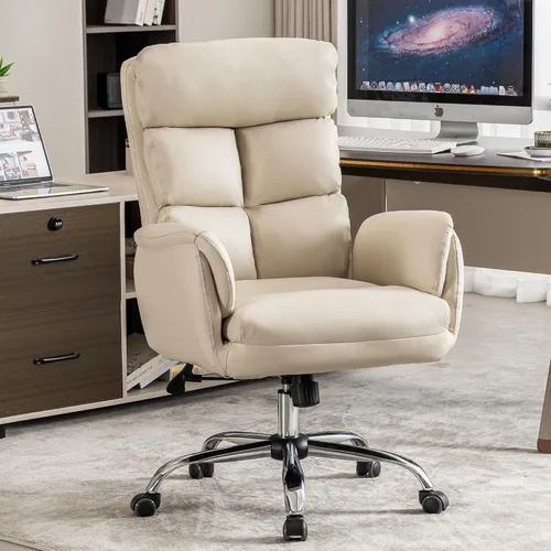 Diseño ergonómico: esta silla de oficina está construida pensando en la comodidad y la capacidad de ajuste. El asiento ajustable en altura te permite combinar varios niveles de escritorio con facilidad, mientras que el respaldo contorneado soporta la curva natural de tu columna vertebral. Este diseño reflexivo ayuda a reducir la tensión de la espalda y garantiza una comodidad duradera durante todo tu día de trabajo. Diseño moderno: Con un aspecto elegante y contemporáneo, esta silla de oficina está equipada con un reposacabezas de apoyo que combina perfectamente con diferentes interiores de oficina. Las texturas refinadas añaden un toque de sofisticación, mientras que los reposabrazos acolchados en ambos lados mejoran su atractivo visual y proporcionan un apoyo suave pero estable para tus brazos, ayudando a aliviar la tensión del hombro. Resistente y duradera: esta silla de oficina cuenta con una base de metal resistente y ruedas resistentes para una durabilidad y capacidad de peso excepcionales. Las ruedas de nailon de 360° ruedan suavemente mientras evitan arañazos y ruido. Diseñado para un uso a largo plazo, es una solución confiable para entornos de oficina modernos. Material premium: esta silla de oficina está hecha de piel sintética de alta calidad, agradable al tacto y transpirable, con un cojín de asiento de doble capa y reposabrazos acolchados. El material resistente al desgaste garantiza una belleza y comodidad duraderas, por lo que es una opción duradera y elegante para cualquier espacio de trabajo. Fácil montaje: viene con instrucciones claras y un conjunto completo de herramientas para un montaje rápido y sin esfuerzo. La superficie de cuero suave y la estructura simple hacen que la limpieza diaria sea fácil, simplemente límpiala con un paño húmedo para refrescar. Nuestro dedicado equipo posventa siempre está listo para ayudar con cualquier pregunta o problema