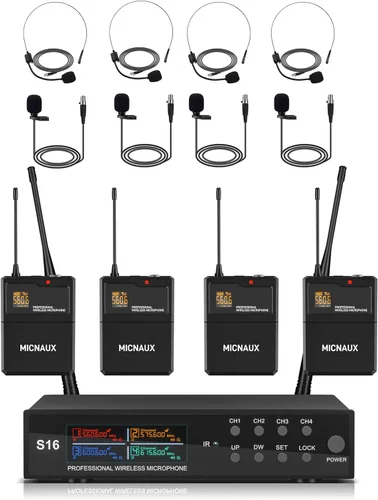 Sistema de micrófono inalámbrico de solapa con auriculares y micrófonos Lavalier, juego de micrófonos UHF Pro de 4 canales con transmisor de paquete