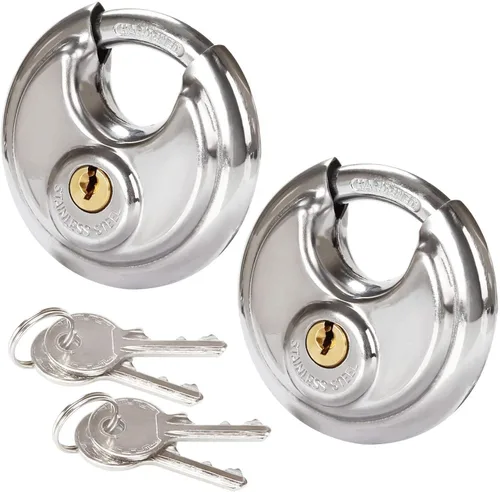 Ampliamente utilizado: para uso en interiores y exteriores. Este candado redondo es bueno para casilleros de almacenamiento público, vainas, unidades de almacenamiento, garajes y cobertizos, remolques, camiones en movimiento y más Gran cerradura: este candado de disco incluye una construcción de acero inoxidable y grillete de acero endurecido para mayor resistencia y seguridad Fuerte seguridad: el grillete blindado evitará que el cortador de pernos intente romperlo. Cilindro cromado de latón y mecanismo de palanca de bloqueo doble que proporcionan resistencia a la palanca y la palanca 【Bloqueo resistente】La cerradura de la unidad de almacenamiento a menudo viene recubierta con cromado que los hace resistentes a la intemperie, resistentes a la corrosión Especificaciones: cuerpo de bloqueo de 2-3/4 pulgadas de ancho; grillete de 3/8 pulgadas de diámetro con 5/8 pulgadas de largo, 3/4 pulgadas de ancho. Viene con cuatro candados redondos y dos llaves iguales cada uno
