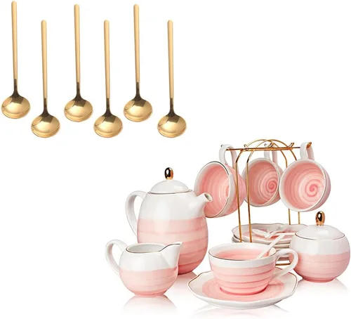 Juego de té de 16 piezas: 4 tazas de té, 4 platillos, 4 cucharas, 1 olla de leche, 1 olla de azúcar, 1 tetera, 1 infusor de acero inoxidable (soporte de exhibición no incluido). Trae elegancia y belleza a tu hogar: nuestro juego de té de porcelana está diseñado por Sweejar. El diseño de modelado es único, superficie con color claro y borde dorado. Este escaparate de artesanía china agregará estilo y color a tu mesa. ¿Necesitas comprar un bonito regalo para tus amigos o familiares? Nuestro mejor juego de teteras, no solo tiene un aspecto hermoso, sino que también es totalmente funcional 4 juegos de tazas, platos y cucharas. Adecuado para té de la tarde, fiesta de té y fiesta de postres. O como un regalo exquisito para alguien especial. Cerámica fiable: el juego de té está hecho de cerámica duradera, apto para lavavajillas. Superficie lisa que aporta buena sensación y sabor. Disfruta de tu té/café, caliente o frío está bien.