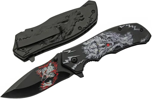 Dimensiones: 8 pulgadas de longitud total con un mango de 4.75 pulgadas. 3.25 pulgadas de longitud de la hoja: 1.2 pulgadas de ancho de 0.138 in de grosor. Fuerte: La hoja de punta de clip con acabado negro de este cuchillo plegable está hecha de acero inoxidable de alta calidad tratado para una retención óptima de los bordes y resistencia al óxido y la corrosión. Mango: El mango de esta navaja está hecho de materiales ABS fuertes y cuenta con un mecanismo de bloqueo de forro y clip de bolsillo para un uso seguro y fácil viaje. Estética: Detalle en el mango de este cuchillo utilitario hay una intensa calcomanía de lobo blanco acentuada por un estampado de lobo blanco y rojo en la hoja para una pieza destacada en cualquier colección. Aplicación: Este es un cuchillo EDC ideal para todas las necesidades diarias de cuchillos convencionales como cortar, perforar y rebanar. Es un excelente cuchillo de regalo para los entusiastas de los cuchillos en tu vida