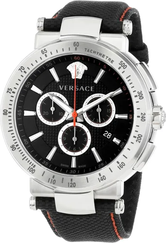 Importado Reloj redondo con bisel taquímetro, manecillas e índices luminosos, tres subesferas y ventana de fecha ampliada a las 4 en punto Caja de acero inoxidable de 1.811 in con ventana de esfera de zafiro antirreflectante Movimiento de cuarzo suizo con visualización analógica Correa de piel de becerro con cierre de hebilla desplegable Resistente al agua hasta 164.0 ft: en general, adecuado para períodos cortos de nado recreativo, pero no para buceo o esnórquel