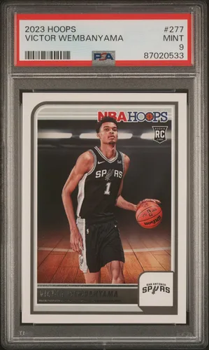 Magnífica tarjeta comercial Hoops 2023 con clasificación PSA del prospecto generacional Victor Wembanyama de los San Antonio Spurs. Esta es una tarjeta coleccionable PSA MINT 9 (Mint). Esta tarjeta está protegida dentro del soporte resistente a manipulaciones PSA y está registrada individualmente en una base de datos de búsqueda en línea proporcionada por PSA.