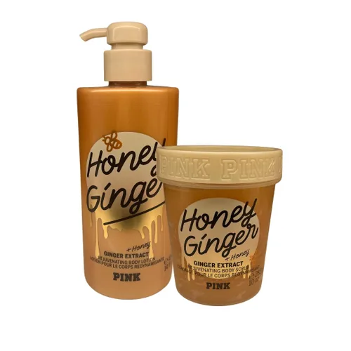 Victoria's Secret Paquete de 2 piezas Pink Honey Ginger Victoria's Secret Loción corporal Pink Honey Ginger – suaviza un poco de hidratación dorada con un toque especiado. Victoria's Secret Exfoliante corporal Pink Honey Ginger - brilla con miel pura, extracto de jengibre y cristales de azúcar que aumentan el resplandor Victoria's Secret Pink Honey Ginger tiene un extracto de jengibre: se sabe que la raíz de jengibre picante y cálida rejuvenece la piel e inspira bienestar.
