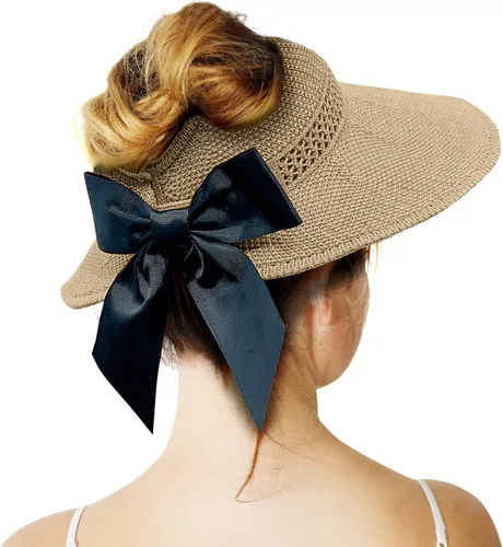 Visera solar de paja para mujer, ala ancha, protección UPF 50+, sombrero de playa, ajustable, plegable, gorra de cola de caballo con correa para la