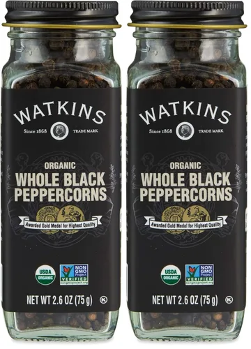 Watkins Gourmet - Tarro de especias orgánicas, granos de pimienta negra entera, sin OMG, Kosher, botella de 2.6 onzas, paquete de 2
