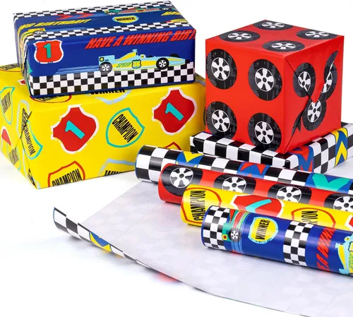 PATRON DE CUMPLEAÑOS: Incluye 4 diseños, autos de carreras, autódromo, letras "CHAMPION" "WINNER", ruedas, todos los patrones coloridos son perfectos para envolver regalos de cumpleaños para bebés varones. Tamaño perfecto: cada rollo mide 17 pulgadas de ancho x 120 pulgadas de largo. Estos rollos no tienen un ancho estándar y son más estrechos que el tamaño habitual. Perfecto para regalos pequeños y medianos. Diseño de rejillas: cada una cuenta con líneas de cuadrícula en el reverso para un corte recto y regalos perfectamente envueltos. Calidad prémium: Creado con materiales de papel de alta calidad, grueso y no se rompe ni rasga fácilmente. El artículo viene con una película retráctil para evitar rayones en el papel de regalo y reducir el polvo. USO PARA TODAS LAS OCASIONES: Cumpleaños, graduaciones, baby showers, fiestas y vacaciones más especiales con regalos envueltos.