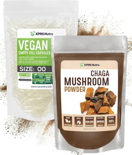 XPRS Nutra Polvo de chaga orgánico de 8 onzas con tamaño 00 cápsulas vacías preseparadas (500 unidades)